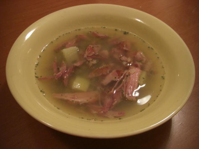 На следующий день снять вымерзший жир с поверности бульона. Добавить очень мелко порезанный или пропущенный через мясорубку репчатый лук, закипятить, добавить промытый горох и варить до полуготовности гороха.