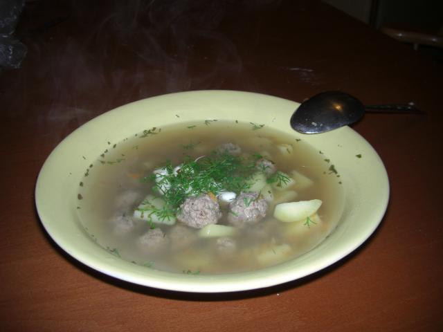 Аккуратно опустить фрикадельки в кипящий суп, когда все фрикадельки всплывут, досолить по вкусу и снять суп с огня.