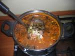 Говядину порезать кубиками 2см х 2см, положить в бульон, довести до кипения, снять пену. Добавить пропущенный через мясорубку или мелко порезанный лук. Варить при слабом кипении 1 час.