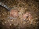Говядину порезать кубиками 2см х 2см, положить в бульон, довести до кипения, снять пену. Добавить пропущенный через мясорубку или мелко порезанный лук. Варить при слабом кипении 1 час.